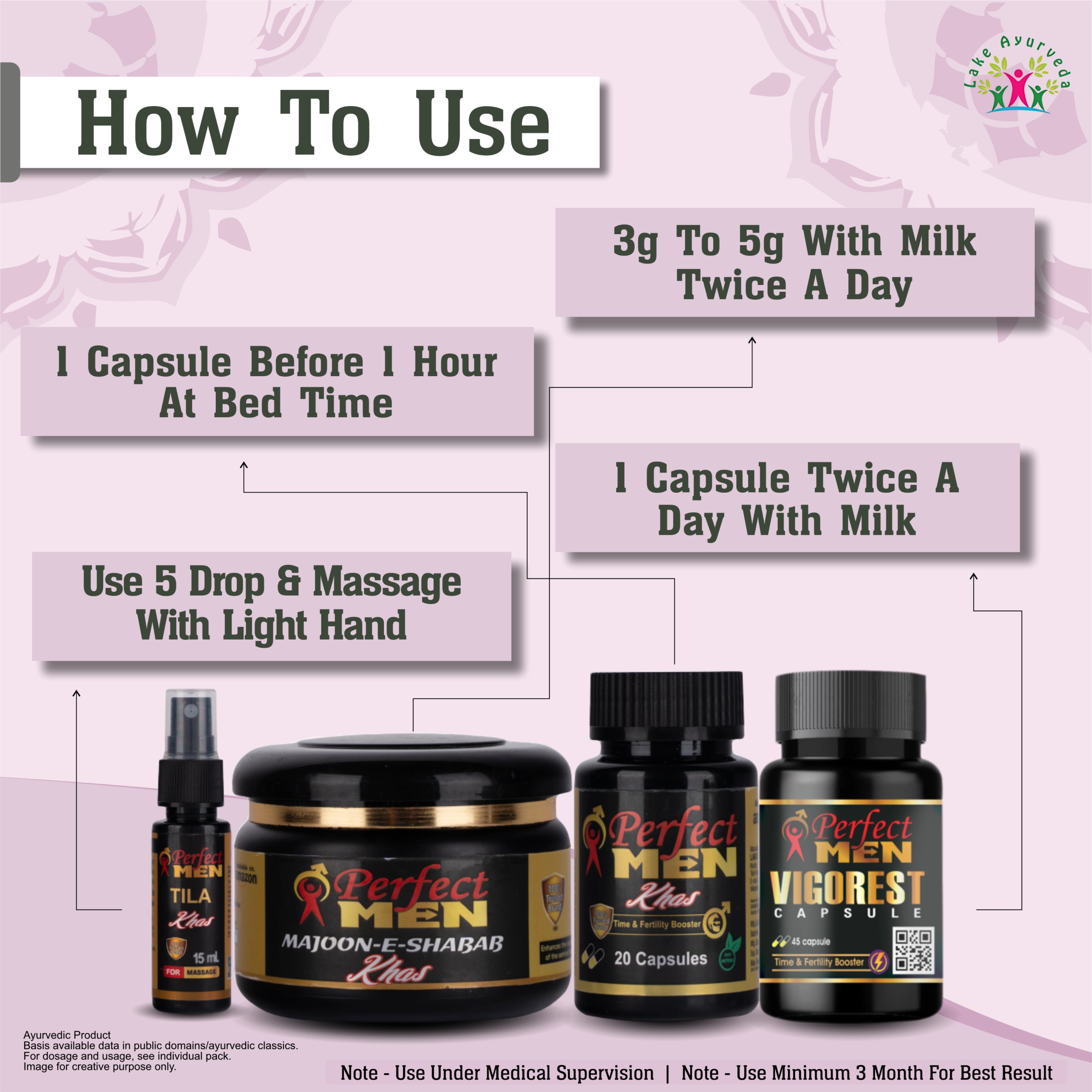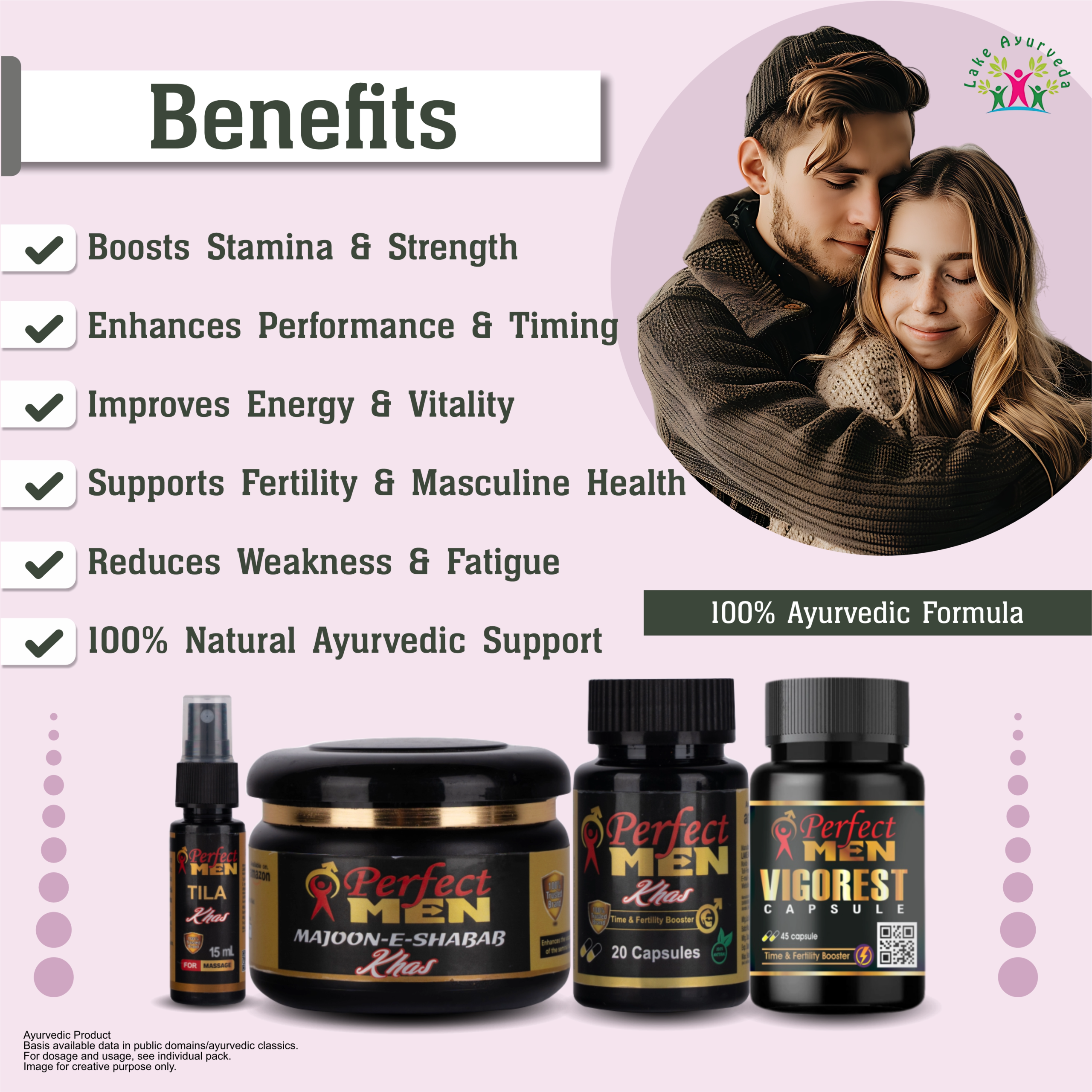 The Perfect Men Super Combo is formulated with natural Ayurvedic ingredients to support male vitality, stamina, and overall wellness. Although it uses traditional, natural components, consulting a healthcare professional before use is recommended—especially for those with chronic conditions, on medications, or planning long-term use. Professional guidance ensures the supplement is safe and effective for individual health needs.