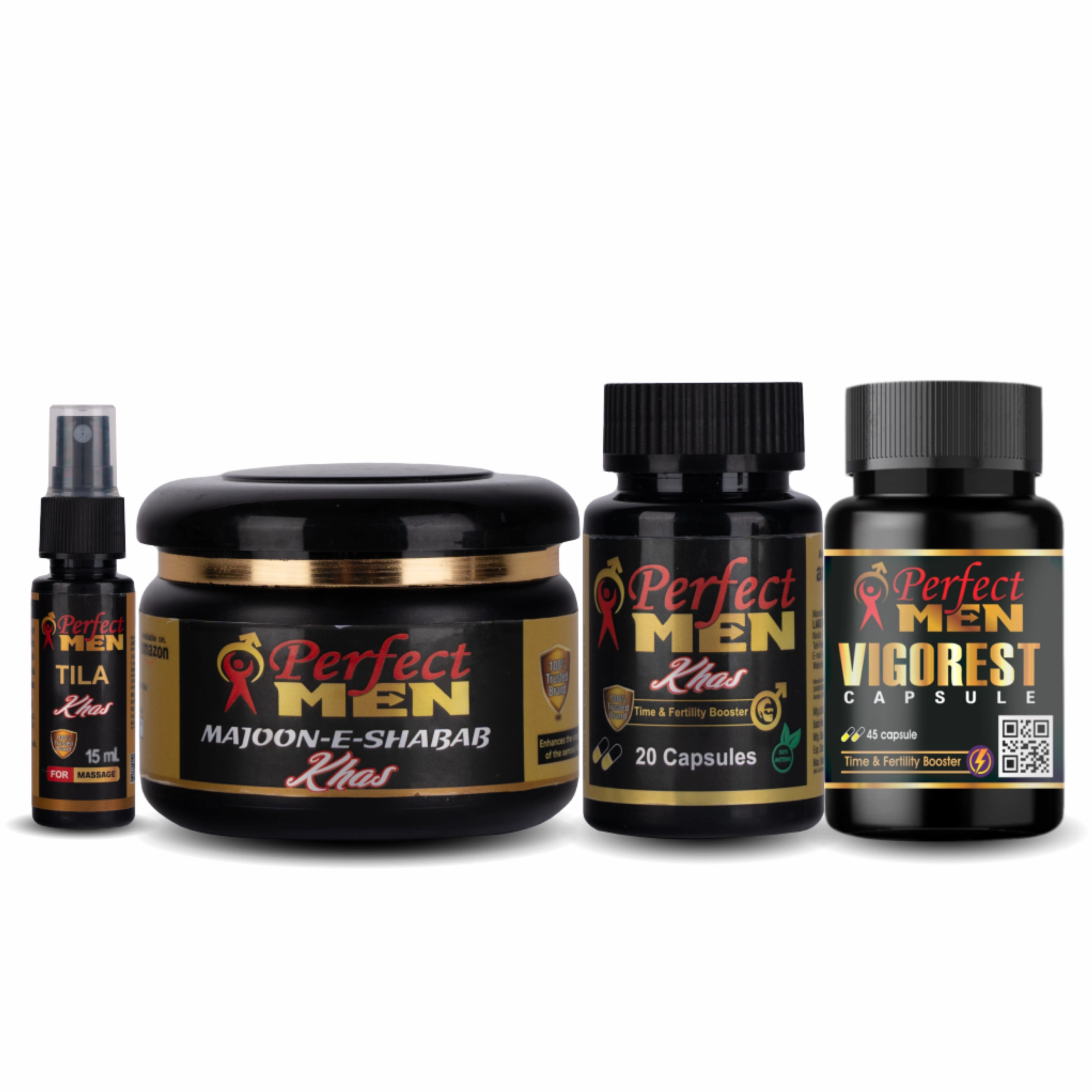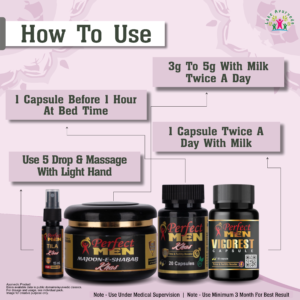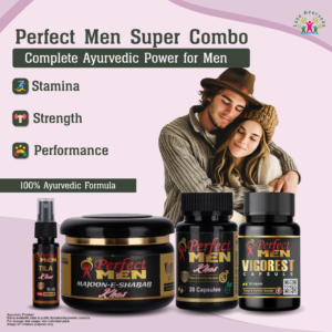 The Perfect Men Super Combo is a complete Ayurvedic wellness system created to enhance male strength, stamina, and overall vitality. It features Perfect Men Tila Khas Spray, Perfect Men Majoon-e-Shabab Khas, Perfect Men Khas Capsule, and Perfect Men Vigorest Gold Capsule—four powerful formulations designed to work synergistically for optimal male wellness.