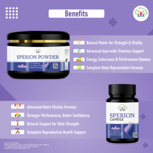 Sperion Kit is a complete two-part Ayurvedic treatment system designed exclusively for men’s reproductive health. It combines Sperion Capsule and Sperion Powder — two complementary formulations that work together to deliver faster, deeper, and longer-lasting results.Unlike single-product solutions, Sperion Kit targets the root cause of male reproductive problems — hormonal imbalance, weak Shukra Dhatu, poor sperm production, and nervous system weakness — using 100% natural Ayurvedic ingredients.Whether you are struggling with nightfall (swapandosh), low sperm count, poor sperm motility, or general fatigue and weakness, Sperion Kit is designed to restore your confidence and reproductive health from within.