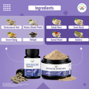 Sperion Kit is an Ayurvedic combination of Capsule and Powder formulated for men suffering from low sperm count (oligospermia), poor sperm motility (asthenozoospermia), frequent nocturnal emission (nightfall/swapandosh), male weakness, and general reproductive health issues. It helps naturally increase sperm count, improve sperm motility, and stop nightfall without any side effects.